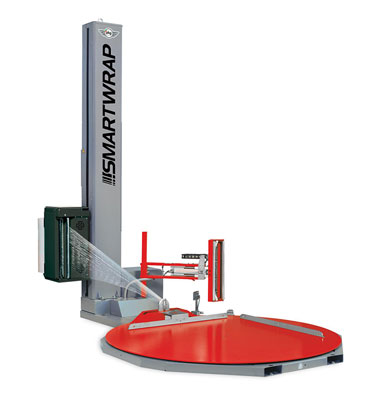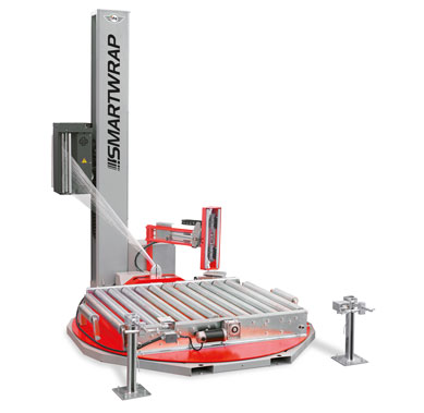 SMARTWRAP-A Automatic stretch wrapper perfect to create a packaging station with motorized roll conveyors in entrance and exit.